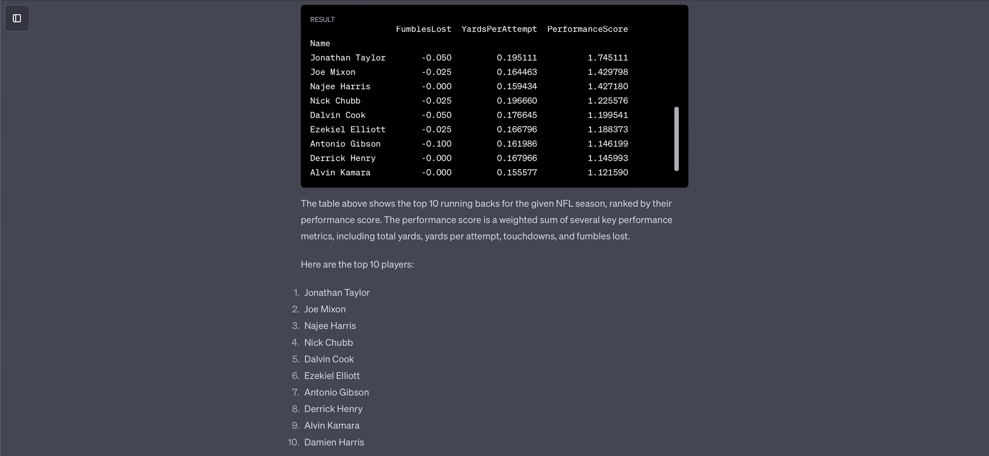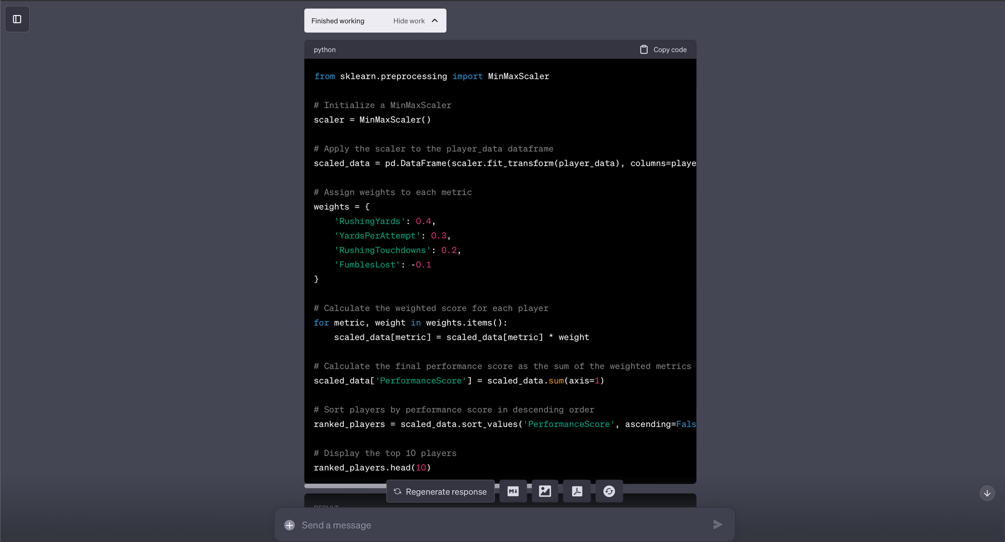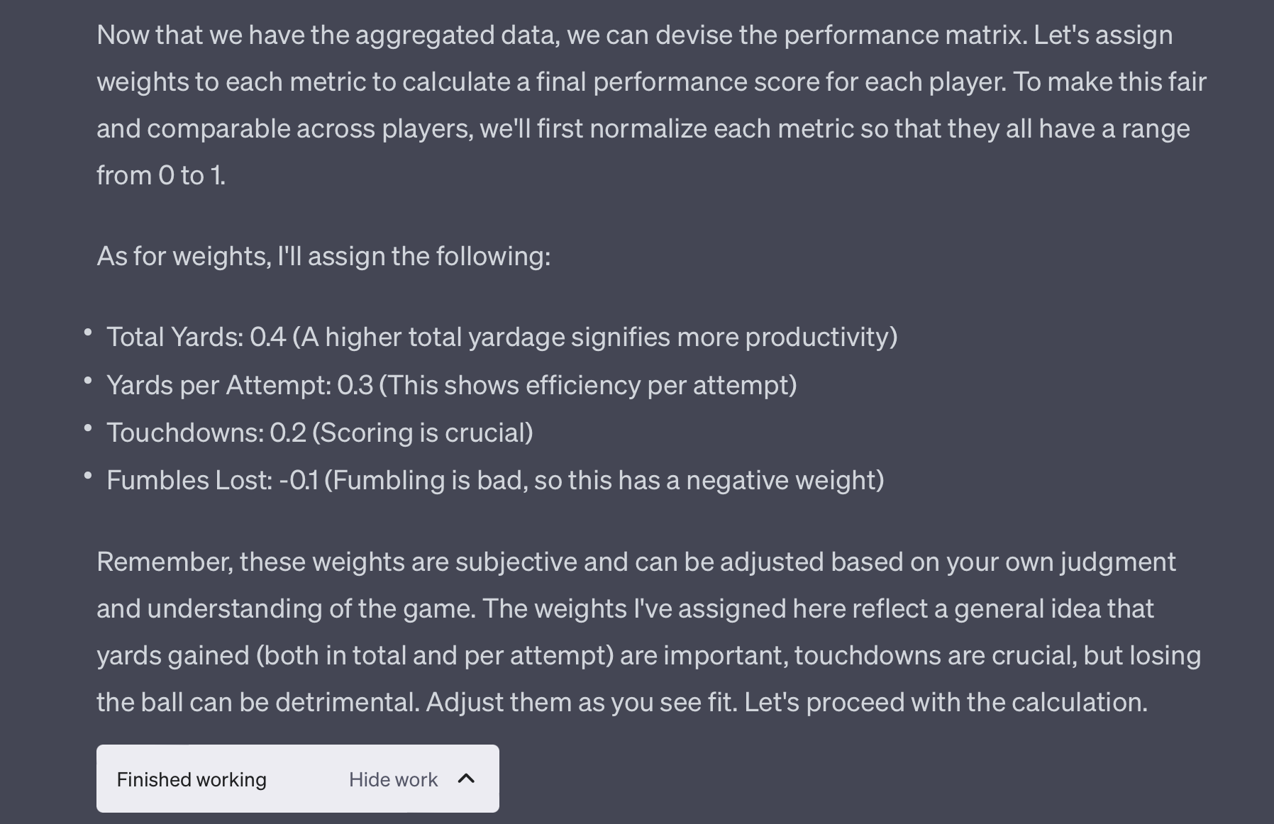 As a data analyst, devise a performance matrix using various metrics such as total yards, yards per attempt, touchdowns, and fumbles to rank all the running backs in the NFL for the given season. How can these metrics be weighted to provide the most accurate representation of overall performance?