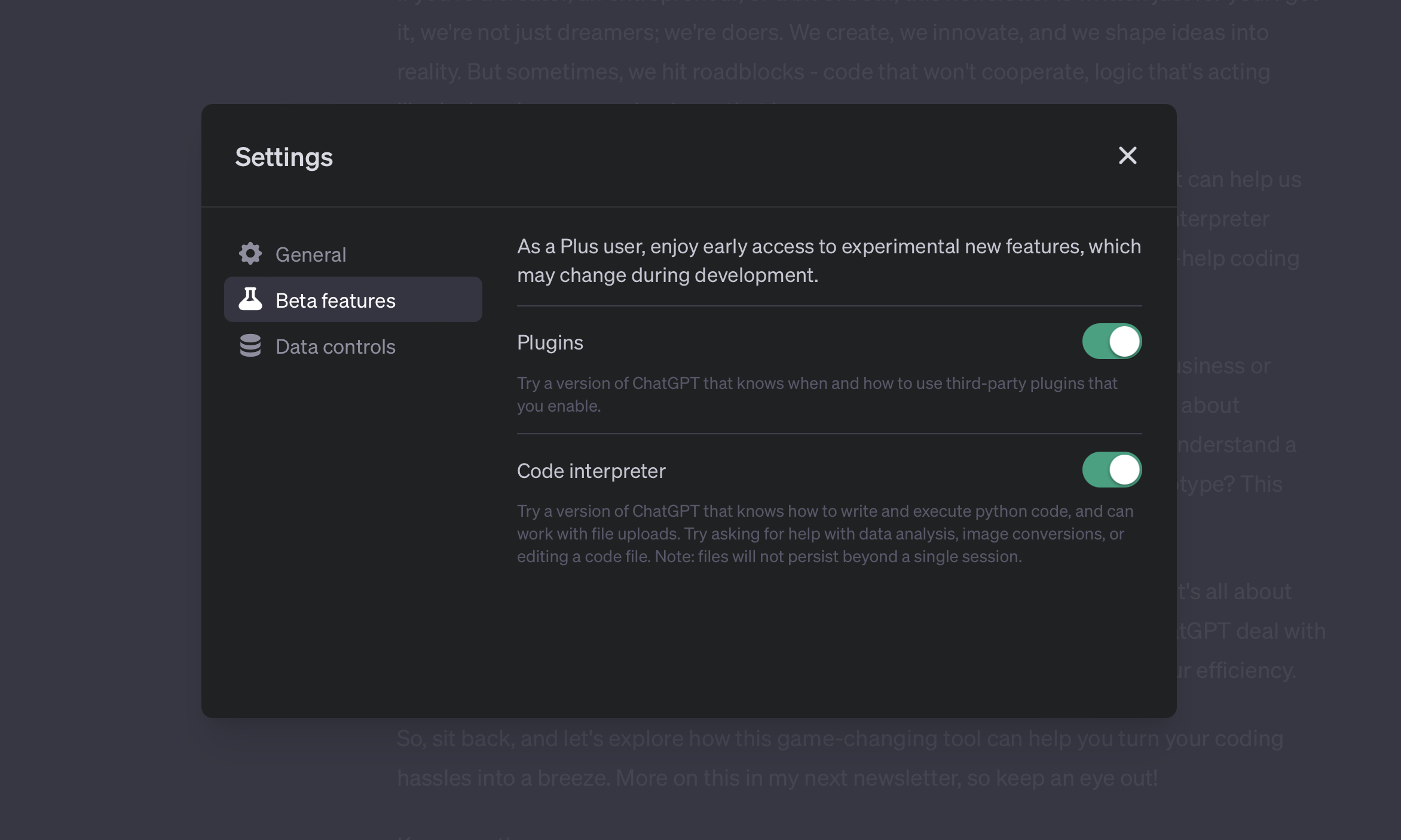 To turn the feature on: Go to your settings, and click “Beta features.” Then switch on the “Code Interpreter” toggle.